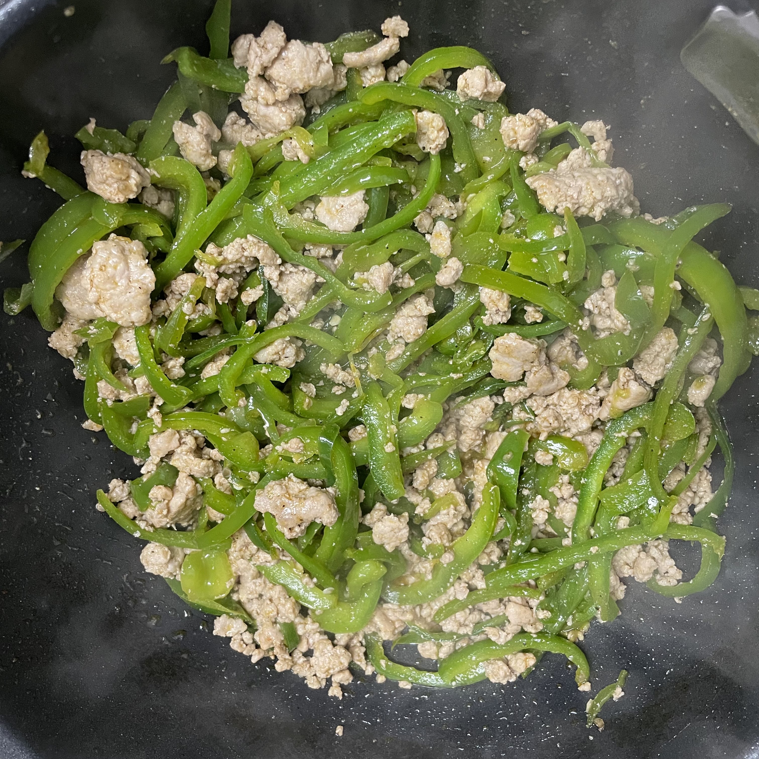 재료 : 다진 돼지고기, 피망, 고추, 굴소스, 고추기름 , 후추