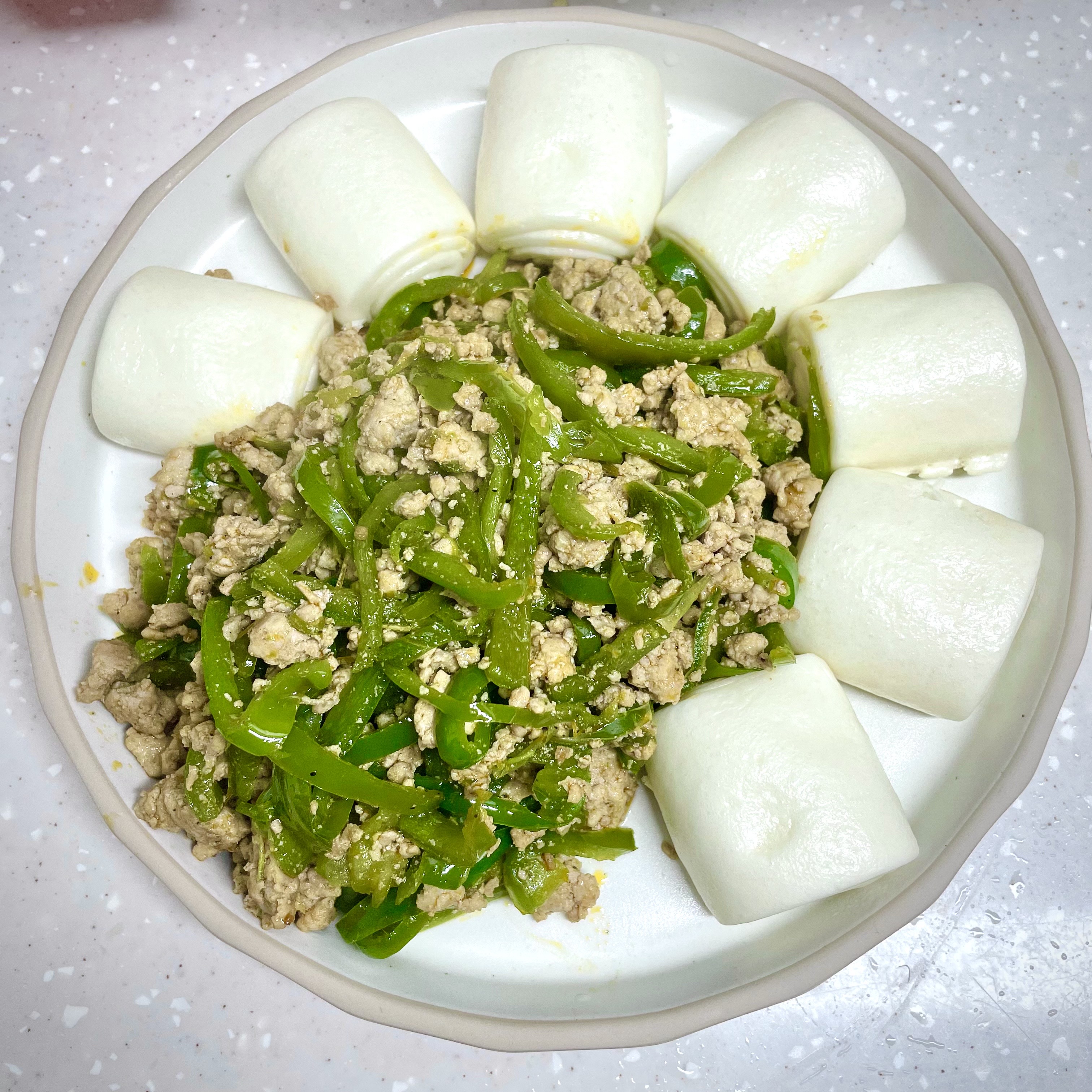 재료 : 다진 돼지고기, 피망, 고추, 굴소스, 고추기름 , 후추