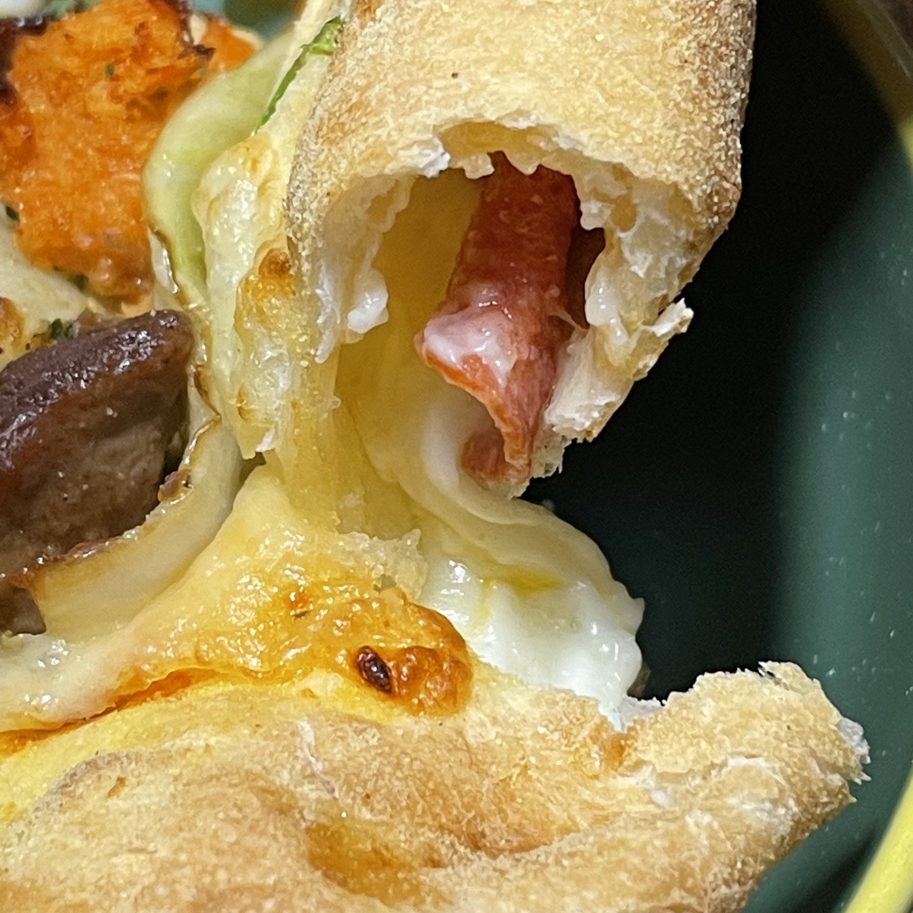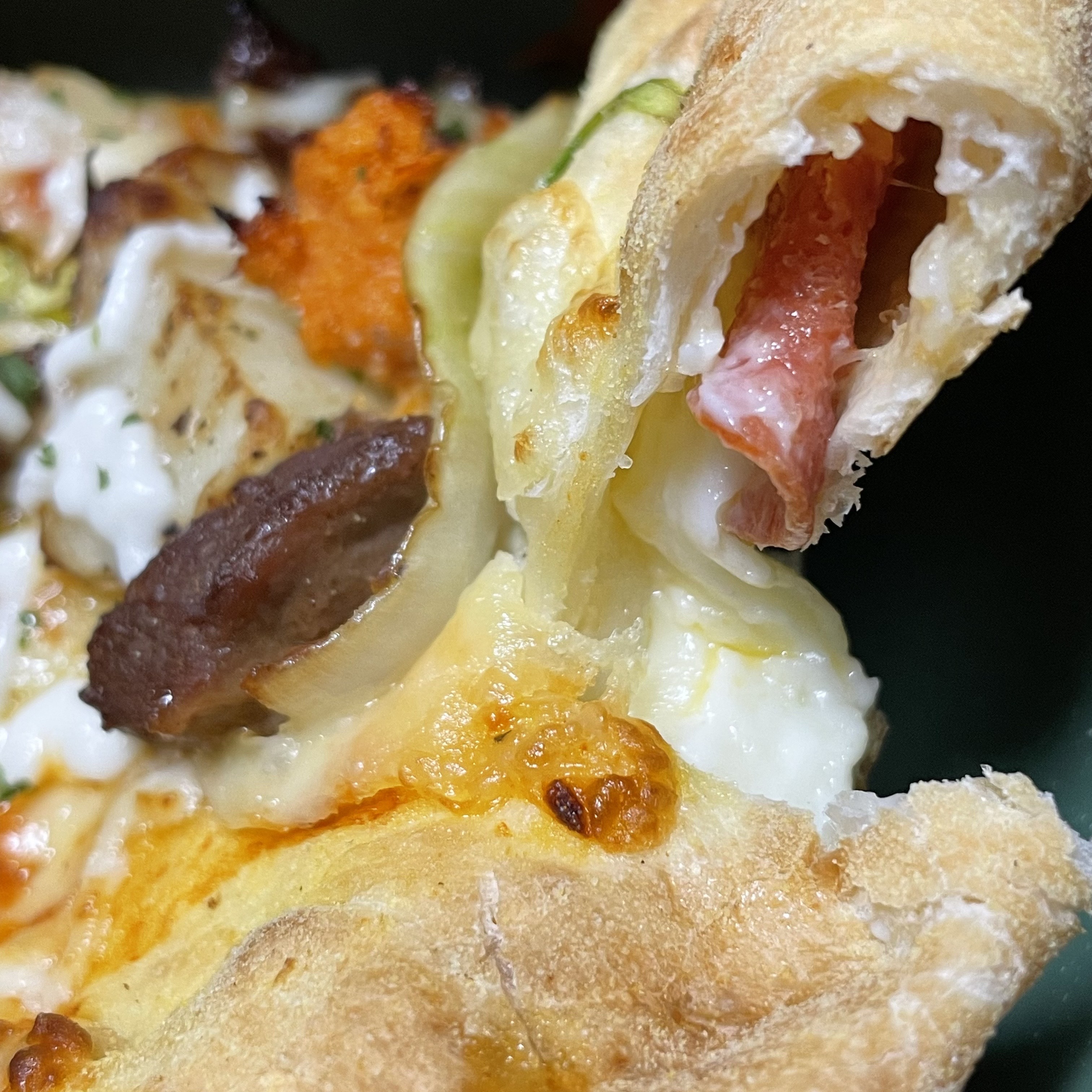 엣지 속에 그뤼에르 크림 치즈 스프레드와 스트링 치즈, 페퍼로니가