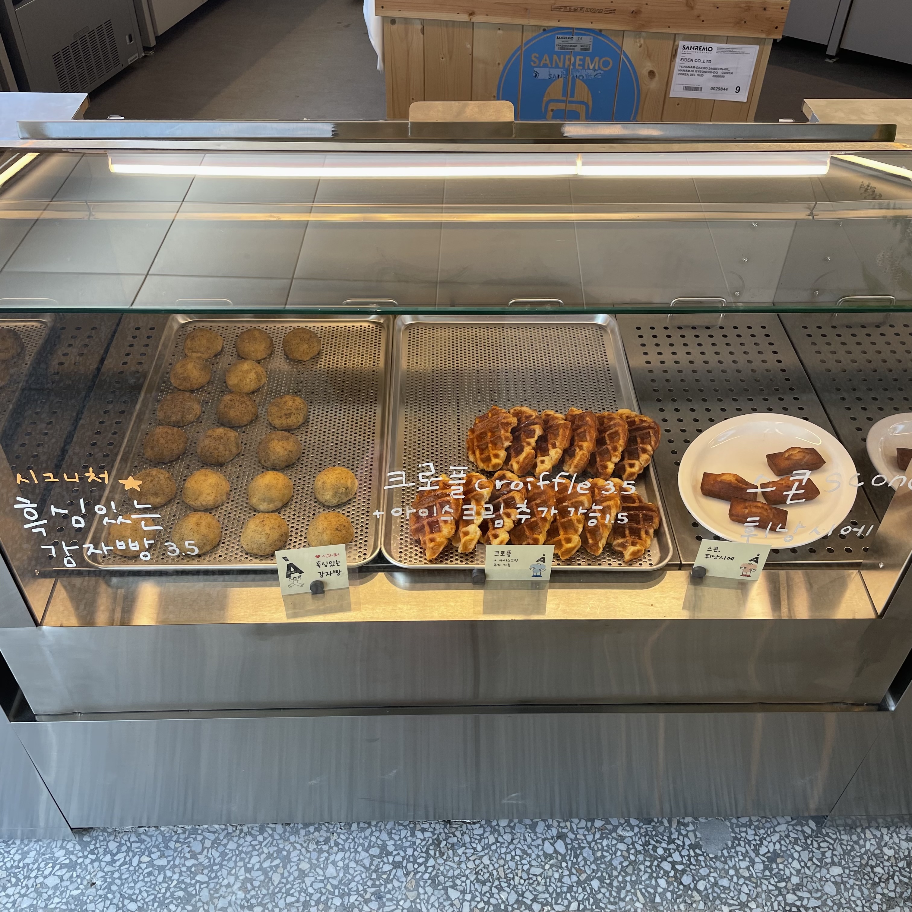 아이스 아메리카노, 오레오 화분스무디, 옥수수 톡톡 파운드 케익, 휘낭시에