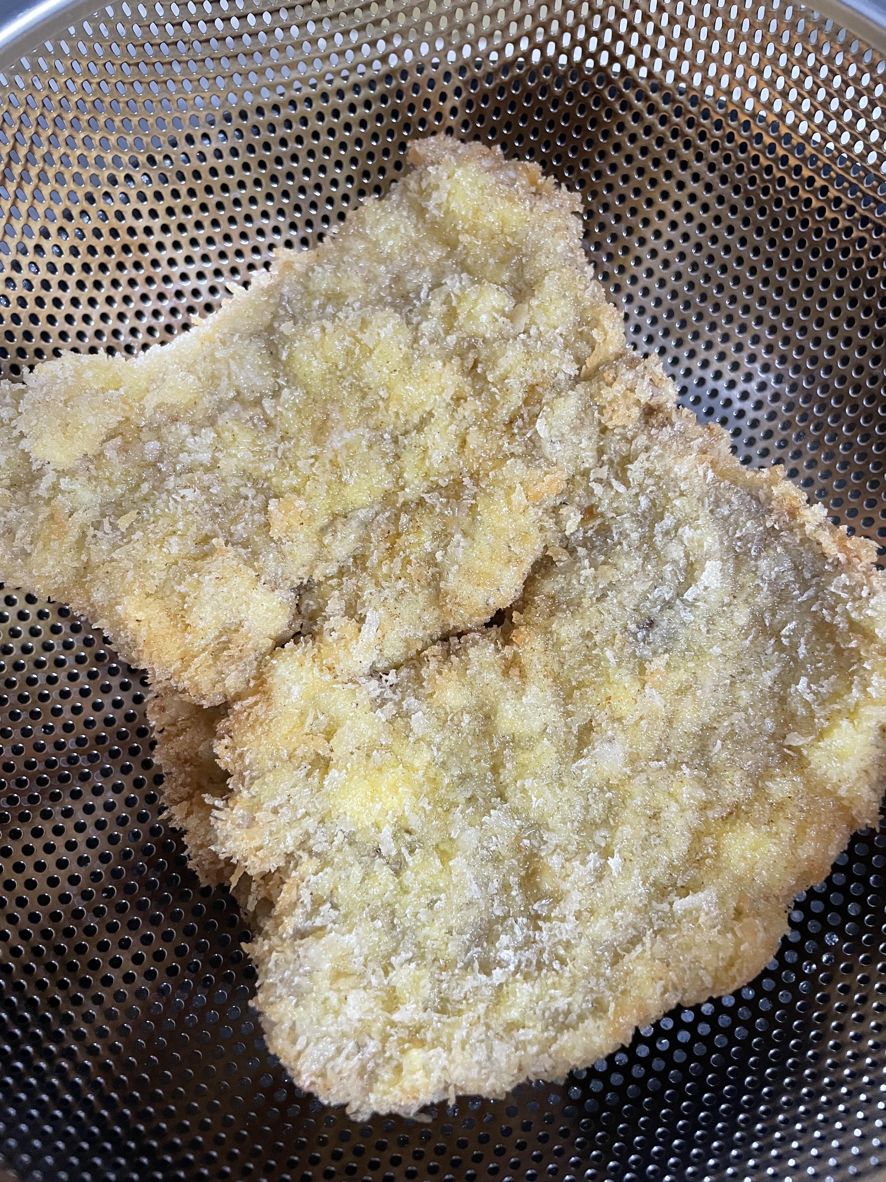 재료 : 뒷다리살, 소금, 후추, 계란, 밀가루, 빵가루, 식용유(많이)