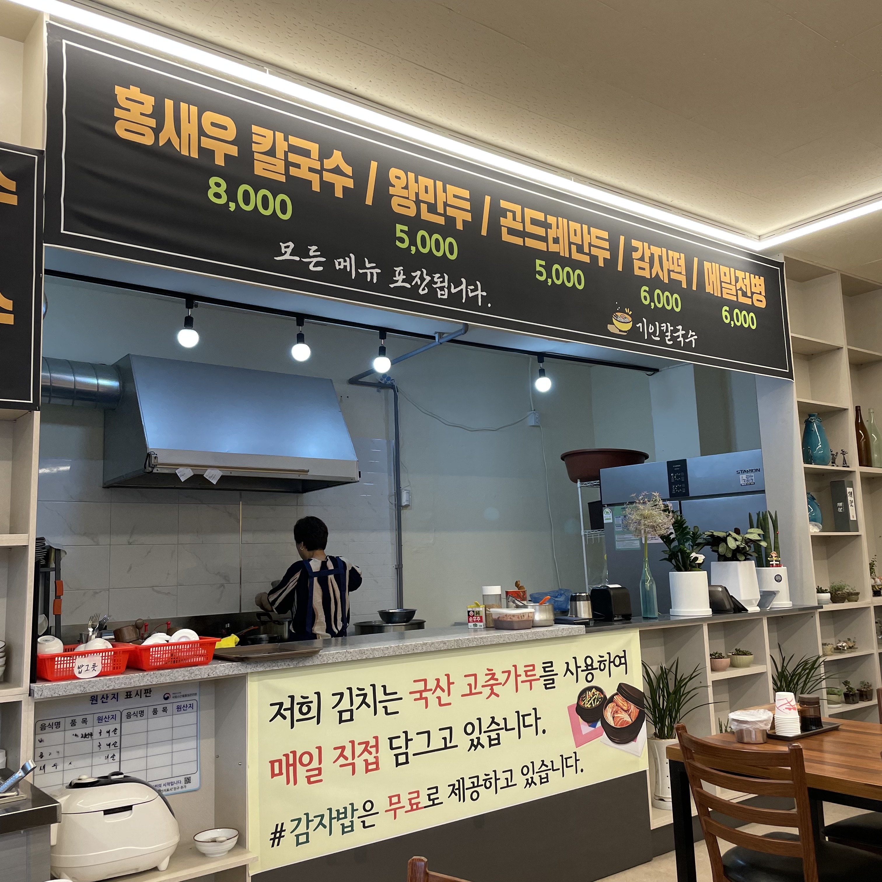 메뉴는 홍새우 칼국수, 냉칼국수, 비빔칼국수, 왕만두, 곤드레만두, 감자떡, 메밀전병